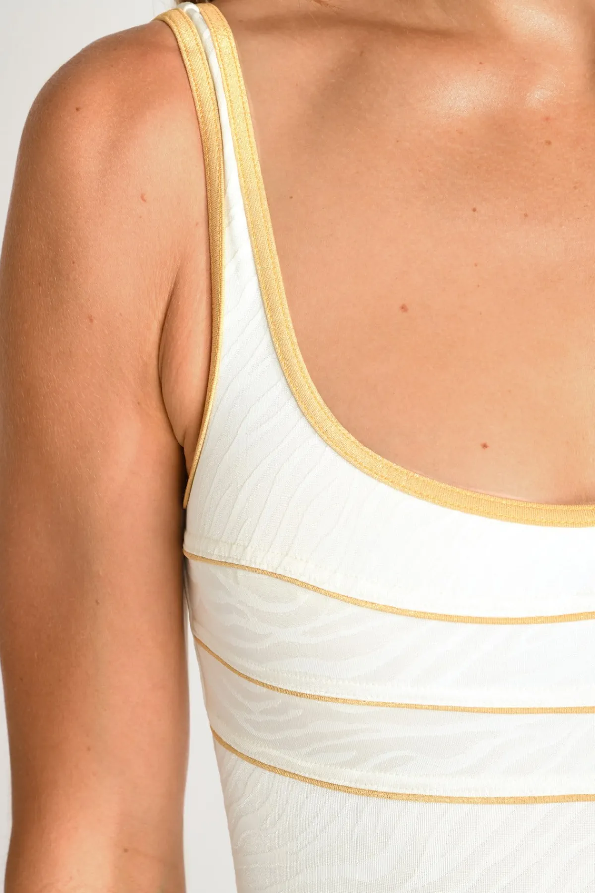 | Description | Maillot de bain une pièce écru ANCOLIE BELLEMARE. C’est la forme best-seller chez Livia Monte-Carlo. Son allure sportive donne un effet retro très tendance. Son motif zèbre mate ton sur ton et ses liserés dorés subliment le maillot. |