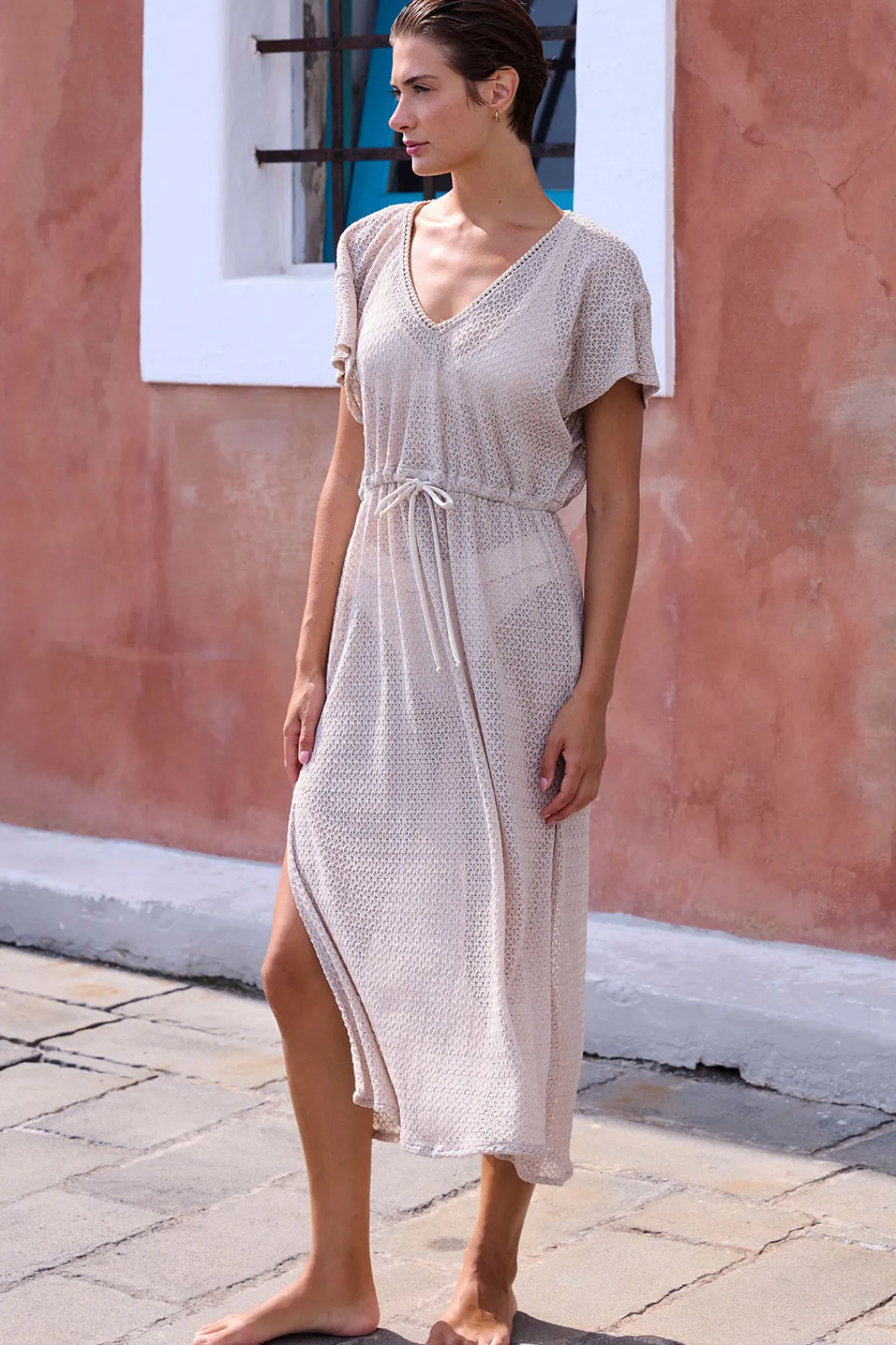 | Détails | • Tunique longue • Couleur sable • Se resserre à la taille • Manche courte • Décolleté V |