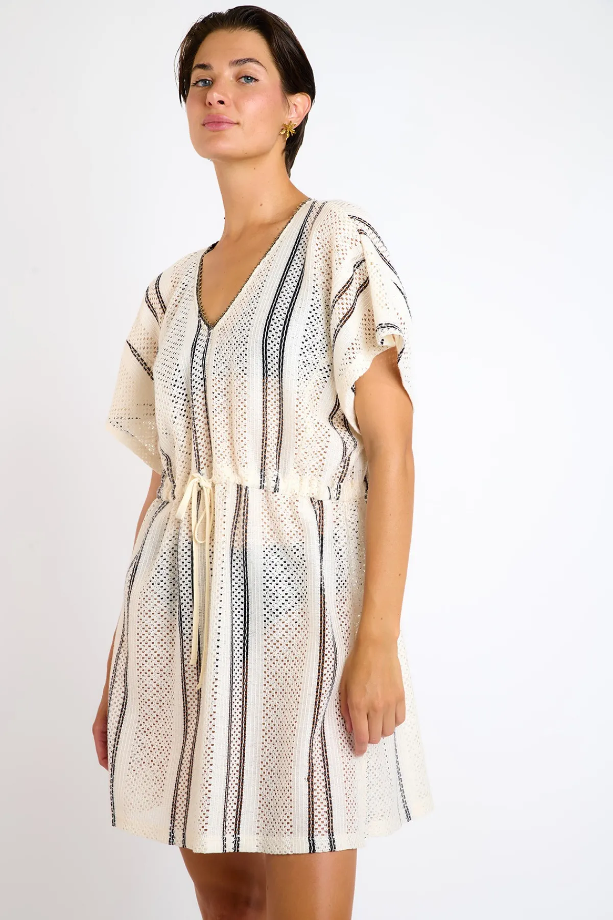 | Détails | • Longueur : au dessus des genoux • Coupe : ample, manches courtes tombantes • Encolure : V féminin • Taille : cordon ajustable pour cintrer selon l’effet souhaité • Matière : maille ajourée légère |