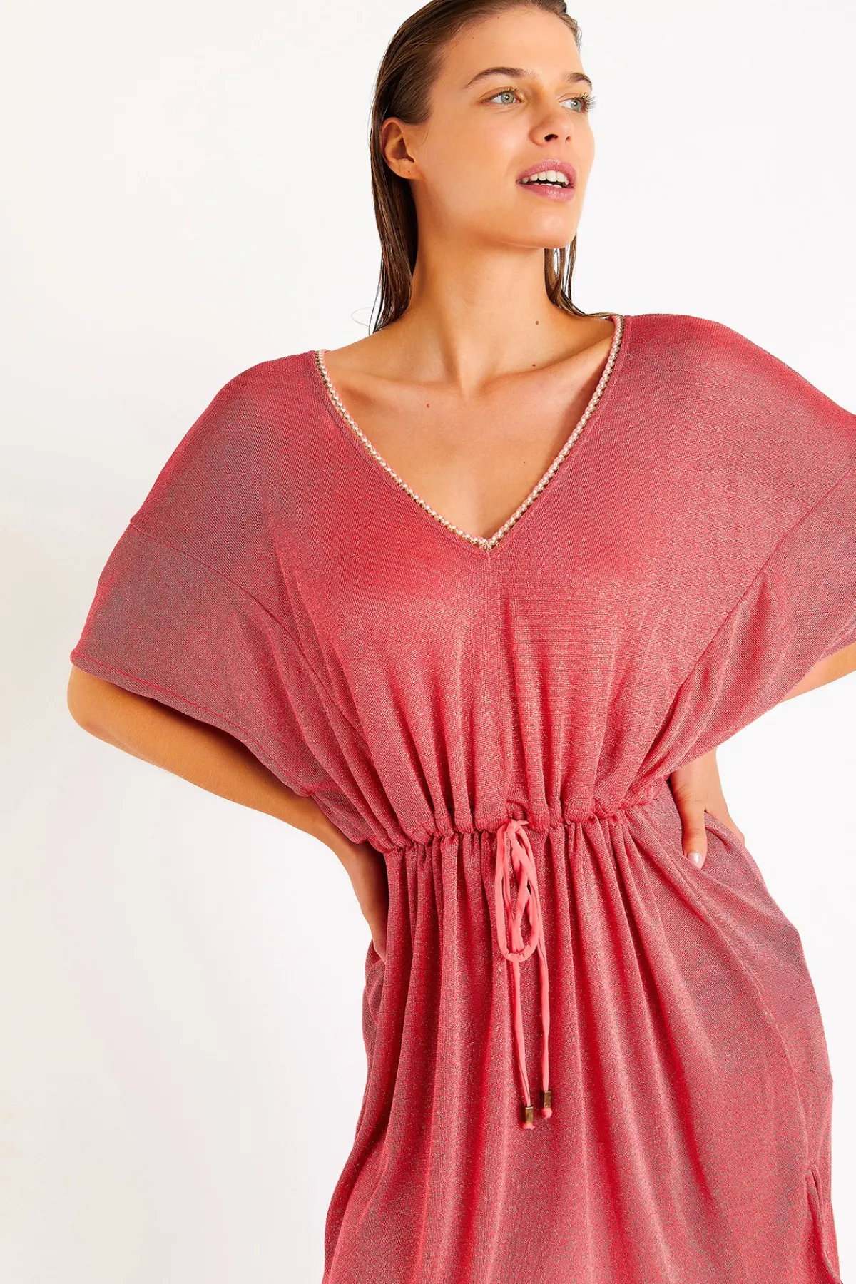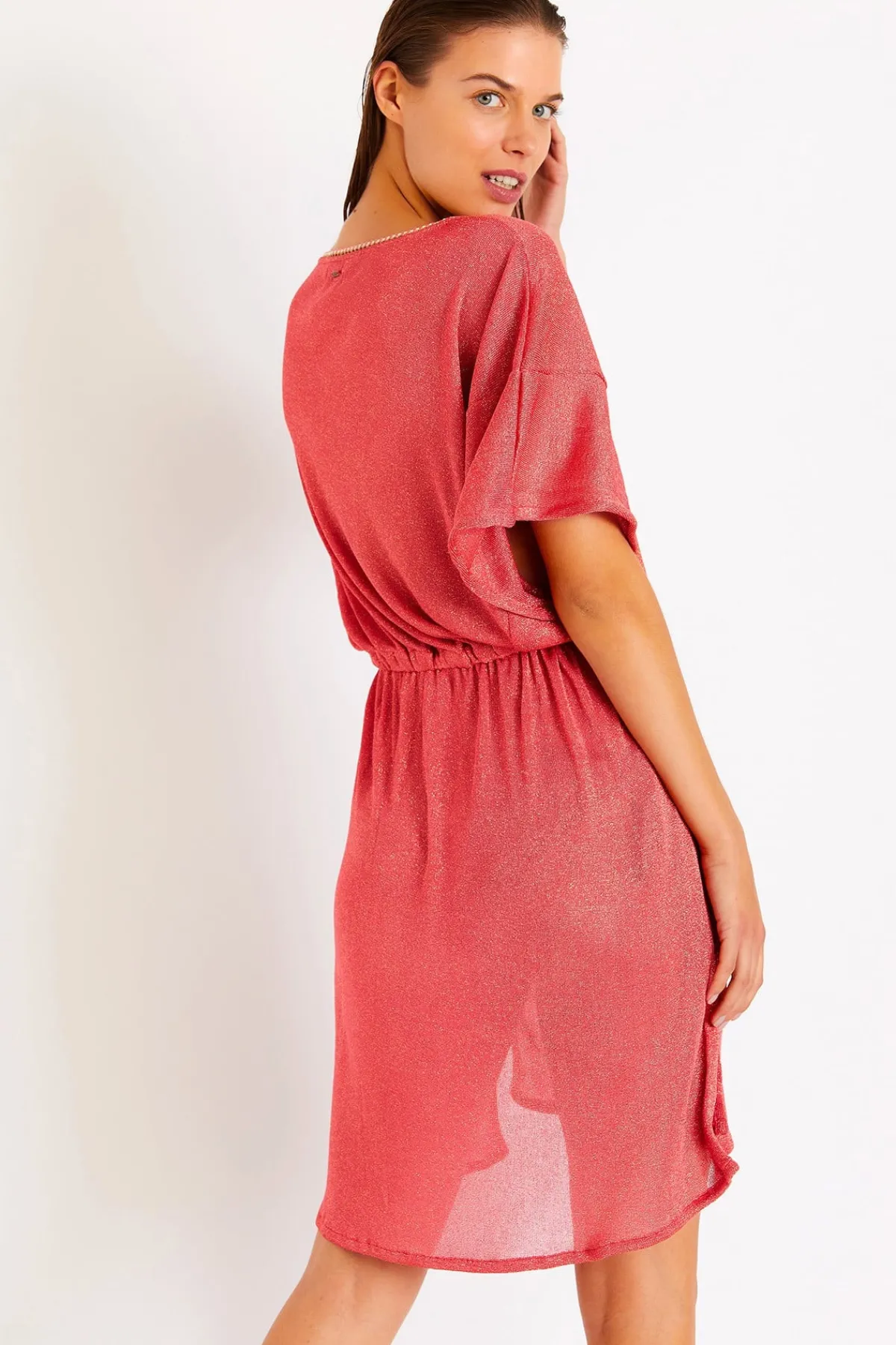 | Détails | • Tunique de plage courteLivia • Fendue sur les cotés • Resserré à la taille • Légèrement transparente • Coloris corail • Décolleté en V |