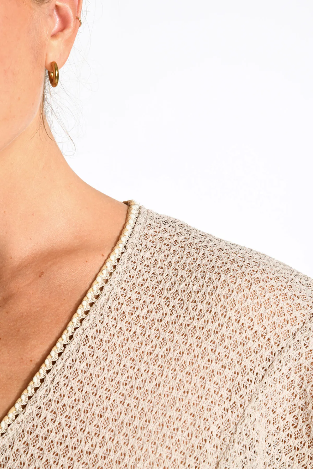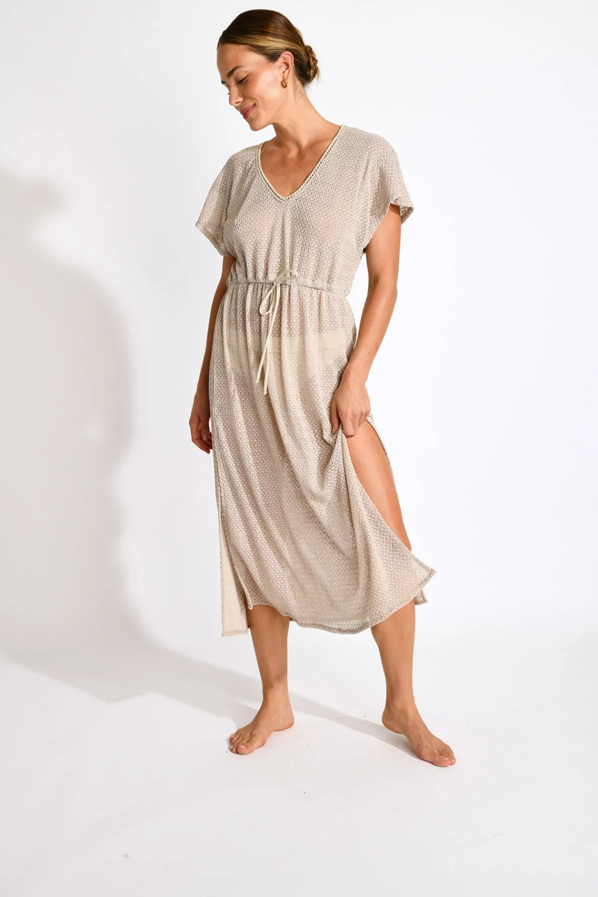 | Détails | • Tunique longue • Couleur sable • Se resserre à la taille • Manche courte • Décolleté V |