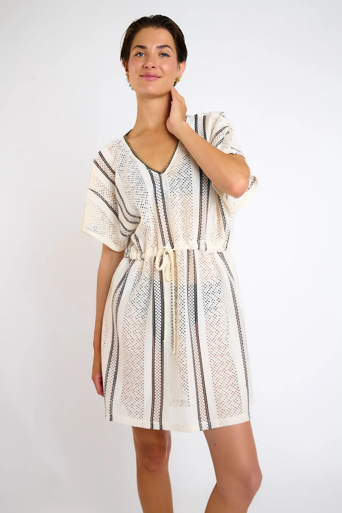 | Détails | • Longueur : au dessus des genoux • Coupe : ample, manches courtes tombantes • Encolure : V féminin • Taille : cordon ajustable pour cintrer selon l’effet souhaité • Matière : maille ajourée légère |
