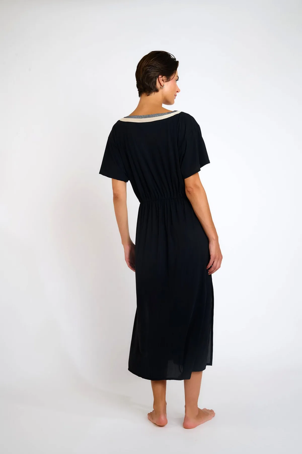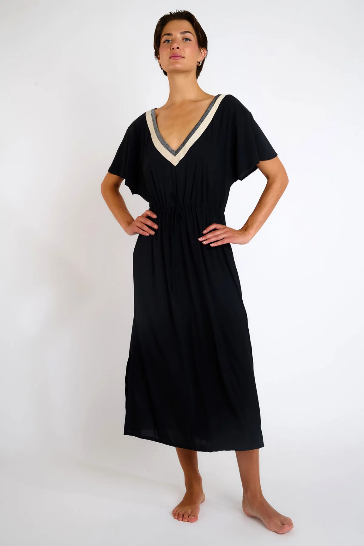 | Détails | • Longueur mi-longue/longue • Décolleté V bordé d’un liseré contrasté • Cordon ajustable sous la poitrine • Coupe fluide, confortable et élancée • Matière douce, légère et extensible |
